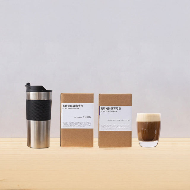 油包式防彈系列新手入門組-1分鐘奶油咖啡+可可+法壓保溫杯-宅時光 - 防彈咖啡8包+防彈可可7包+法壓保溫杯$1940 缺貨中,我們會盡快補貨